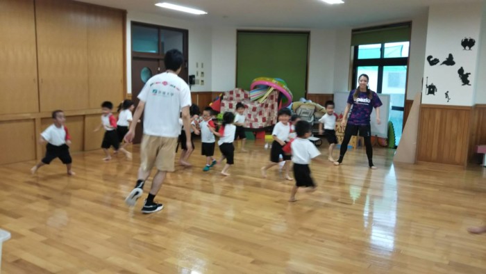 まずはウォーミングアップに鬼ごっこ!にこにこで逃げ回るうみぐみさん♪