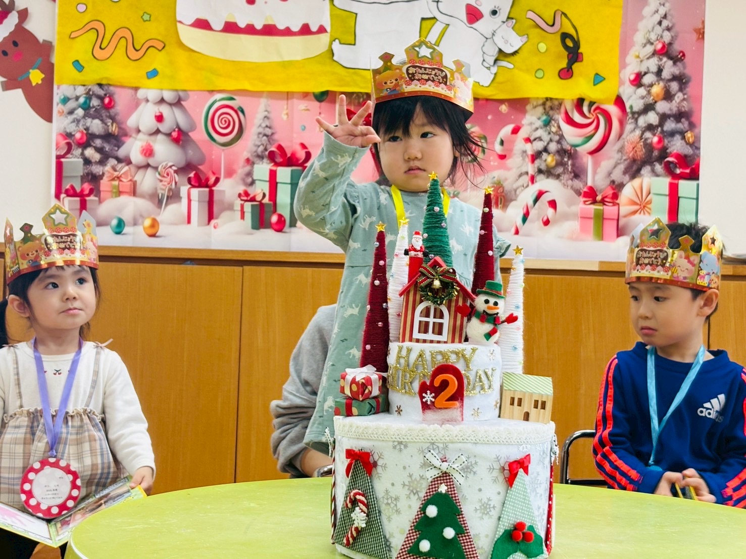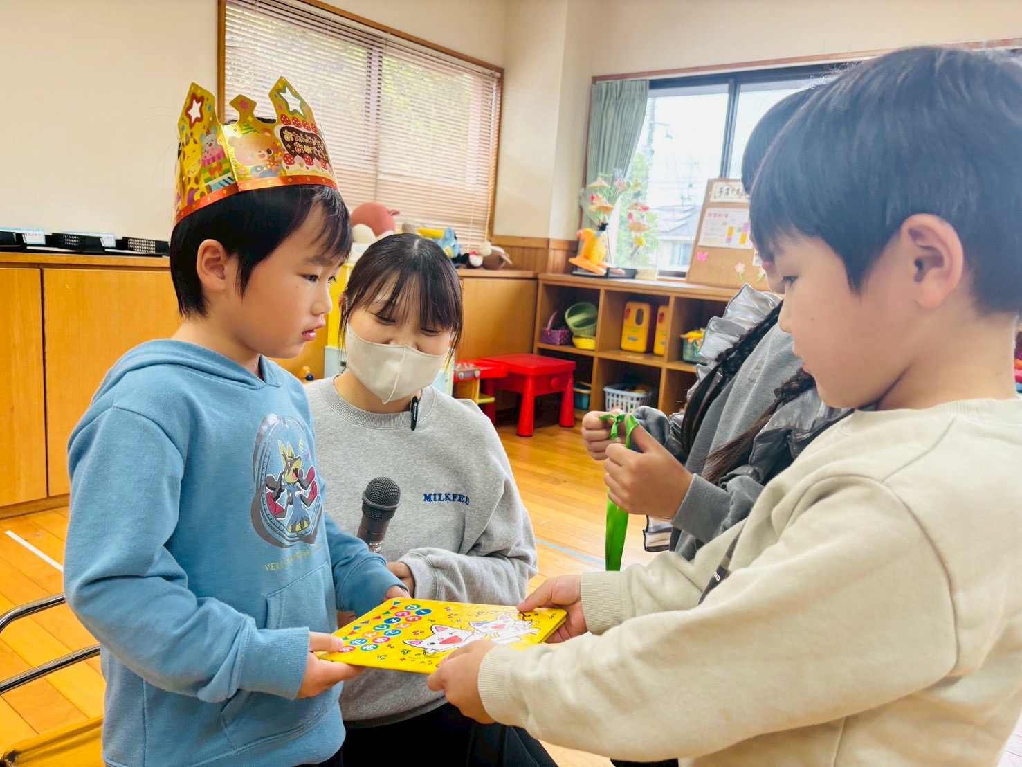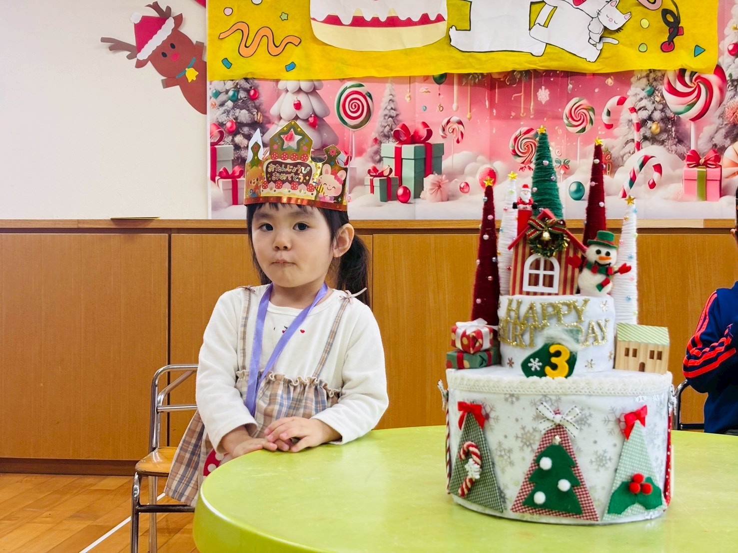 まずはお誕生会です!お友だちにプレゼントやメダルを貰い、ケーキでお祝いしてもらい嬉しそうなお誕生児さんでした💖