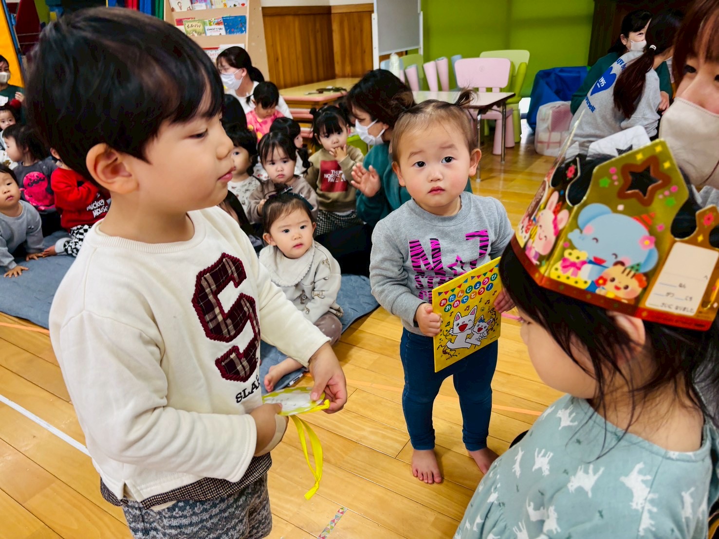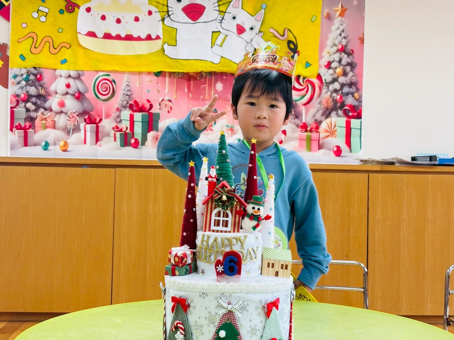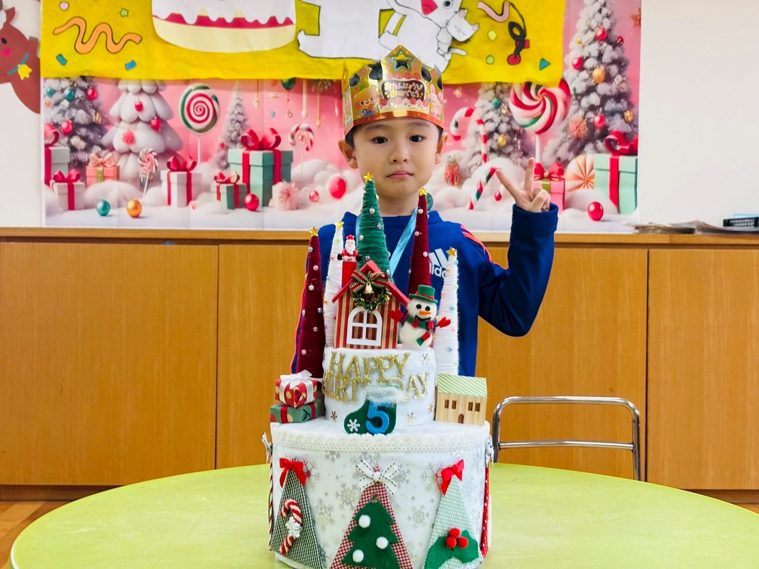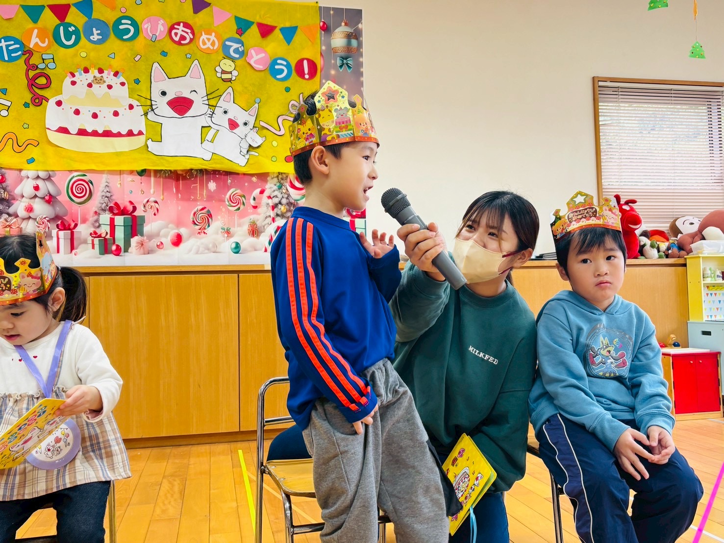 まずはお誕生会です!お友だちにプレゼントやメダルを貰い、ケーキでお祝いしてもらい嬉しそうなお誕生児さんでした💖