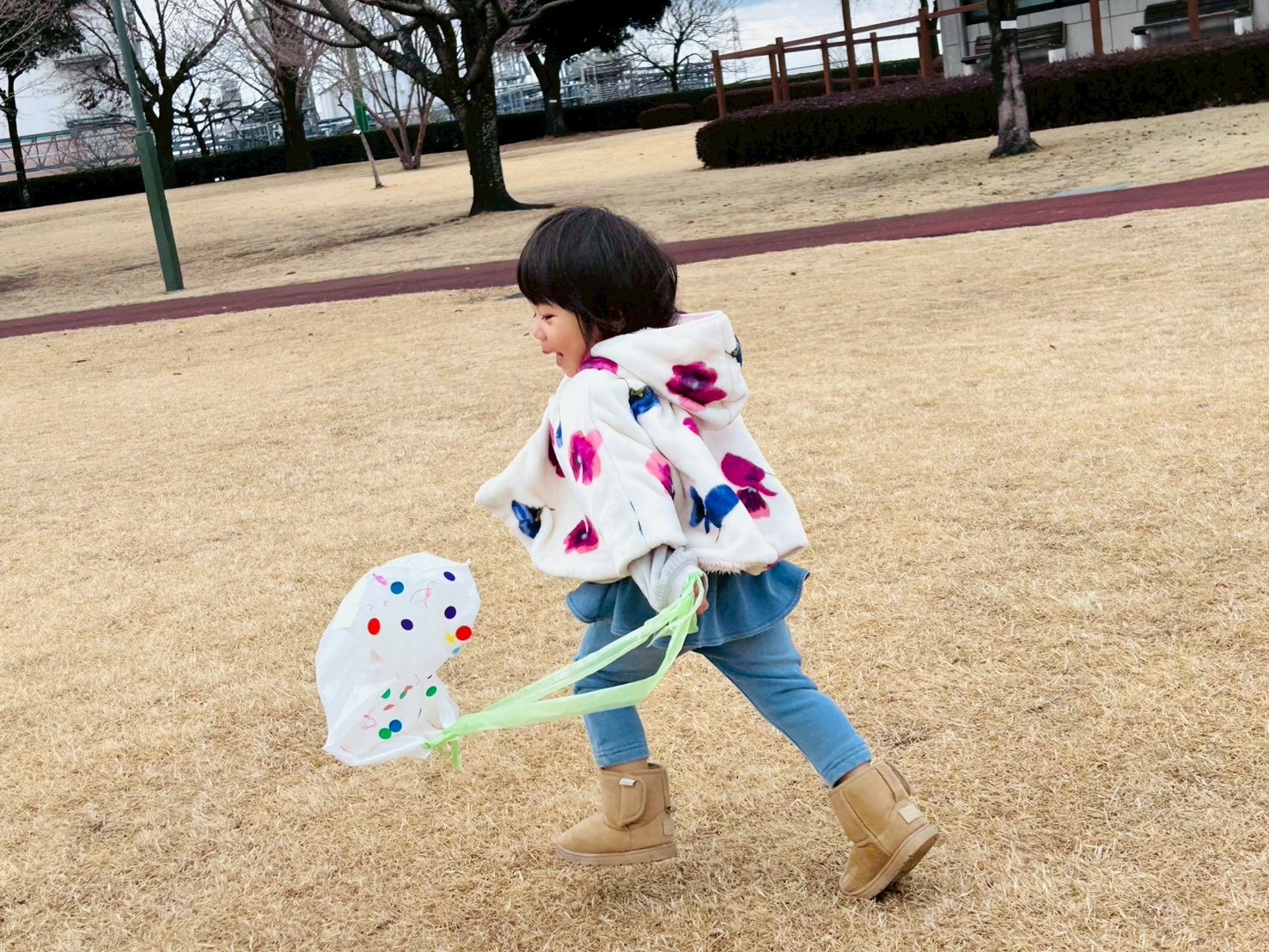 月に1回のさんさん公園での活動!一月は凧揚げでした🪁ビニール袋で凧を手作り!風が強く寒かったですが、そのおかげで凧はよく飛ぶ!みんな大喜びでした😊